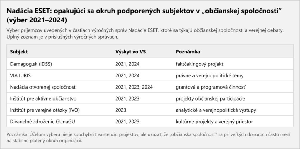 Ak by išlo len o jednu organizáciu, dalo by sa povedať, že ide o izolovaný prípad. Lenže tu prichádza druhá vrstva. ESET má vlastnú Nadáciu ESET a podľa výročných správ podporuje aj ďalšie subjekty z prostredia profesionálnej „občianskej spoločnosti“, ktoré pravidelne vstupujú do sporov o politiku, právo, médiá a rámce verejnej debaty.